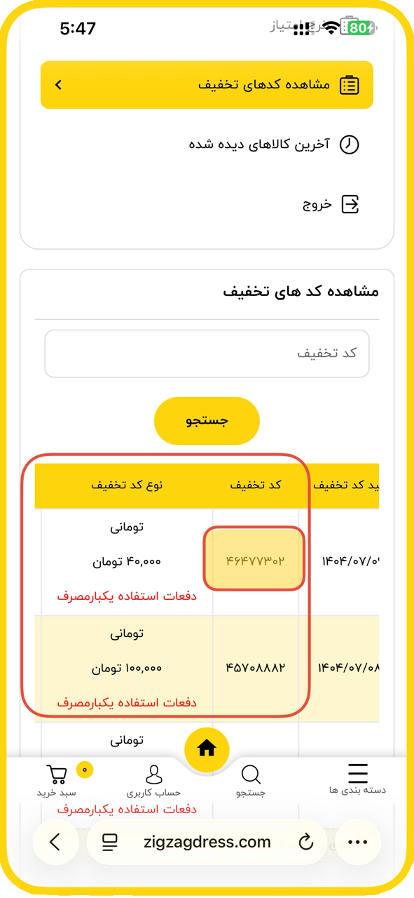 3- بعد از زدن روی دکمه ارسال به صفحه ی مشاده کدهای تخفیف وارد میشید .