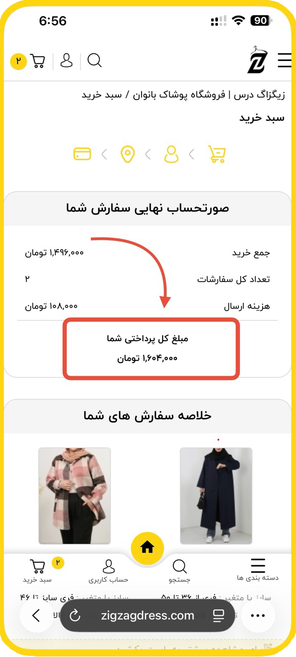 در مرحله اخر سبد خرید مبلغ کل فاکتور به شما نمایش داده میشه .