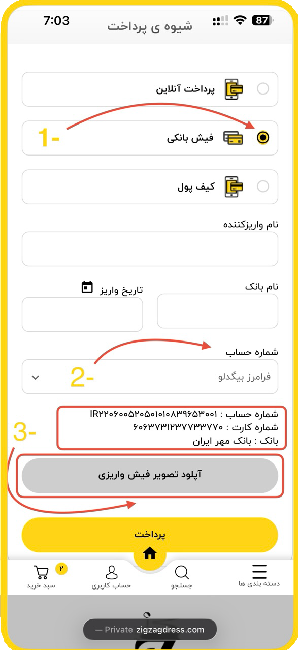 بعد عکس یا اسکن فیش بانکی رو تو قسمت مربوط به فیش بارگذاری کنید تا پرداختتون تایید بشه.
